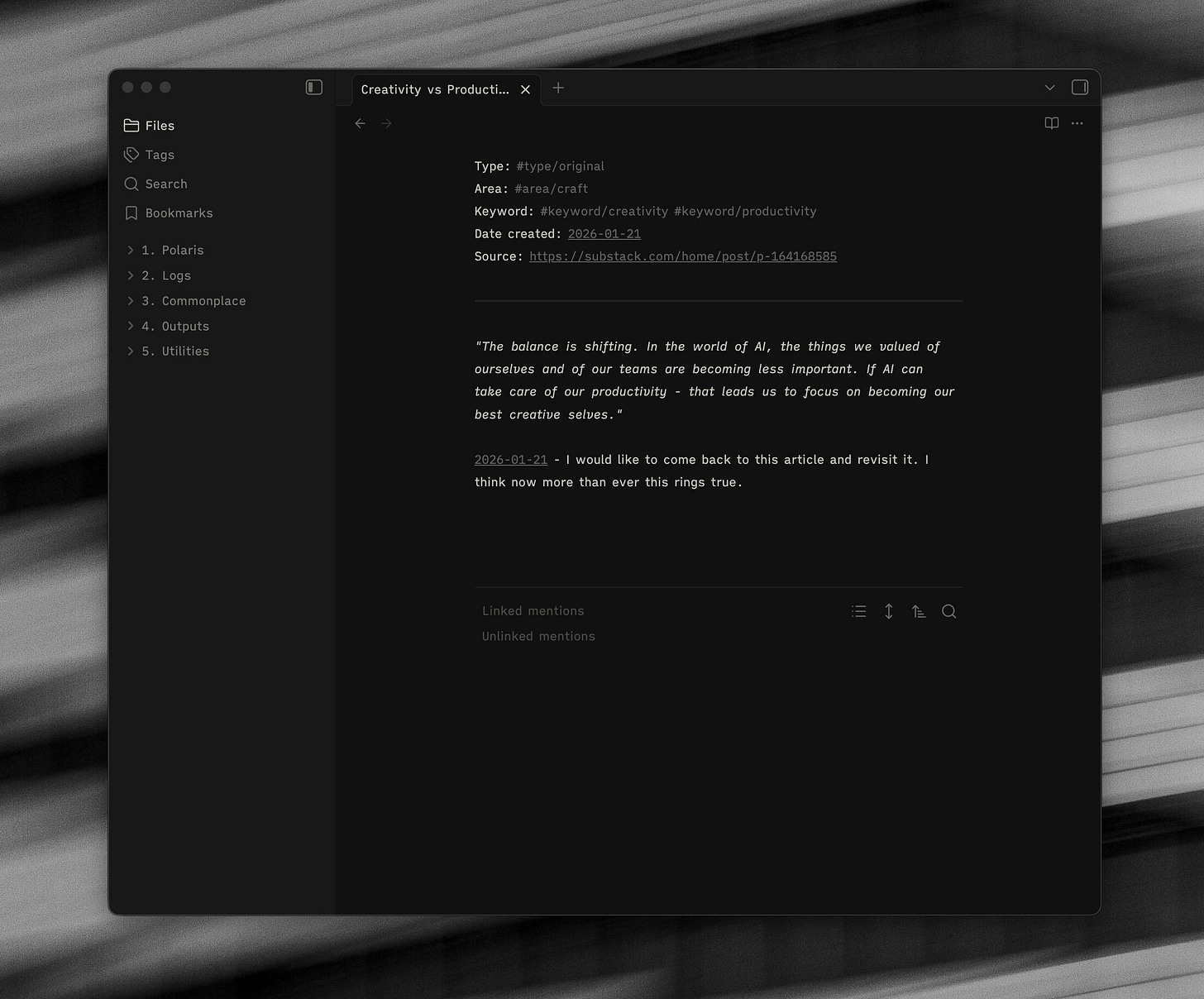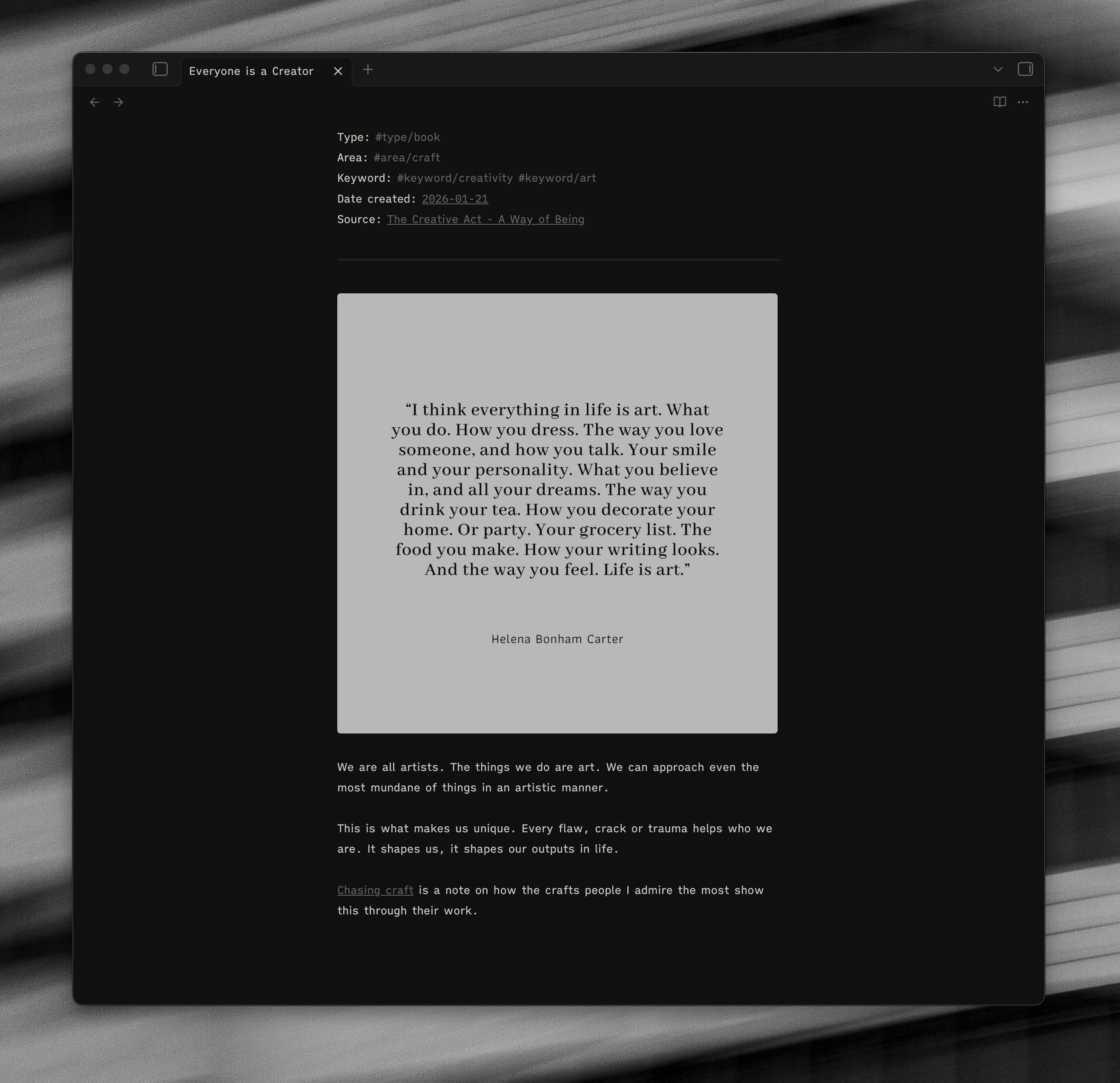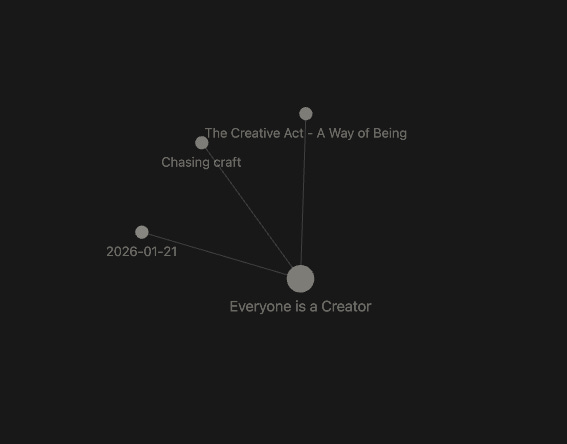 │ ├── create space for thoughtYou can see above I have a note “the creative act”, but I also have notes for ideas that I have taken from that book. They all link up via tags and backlinks - but are able to stand alone as their own independent notes.