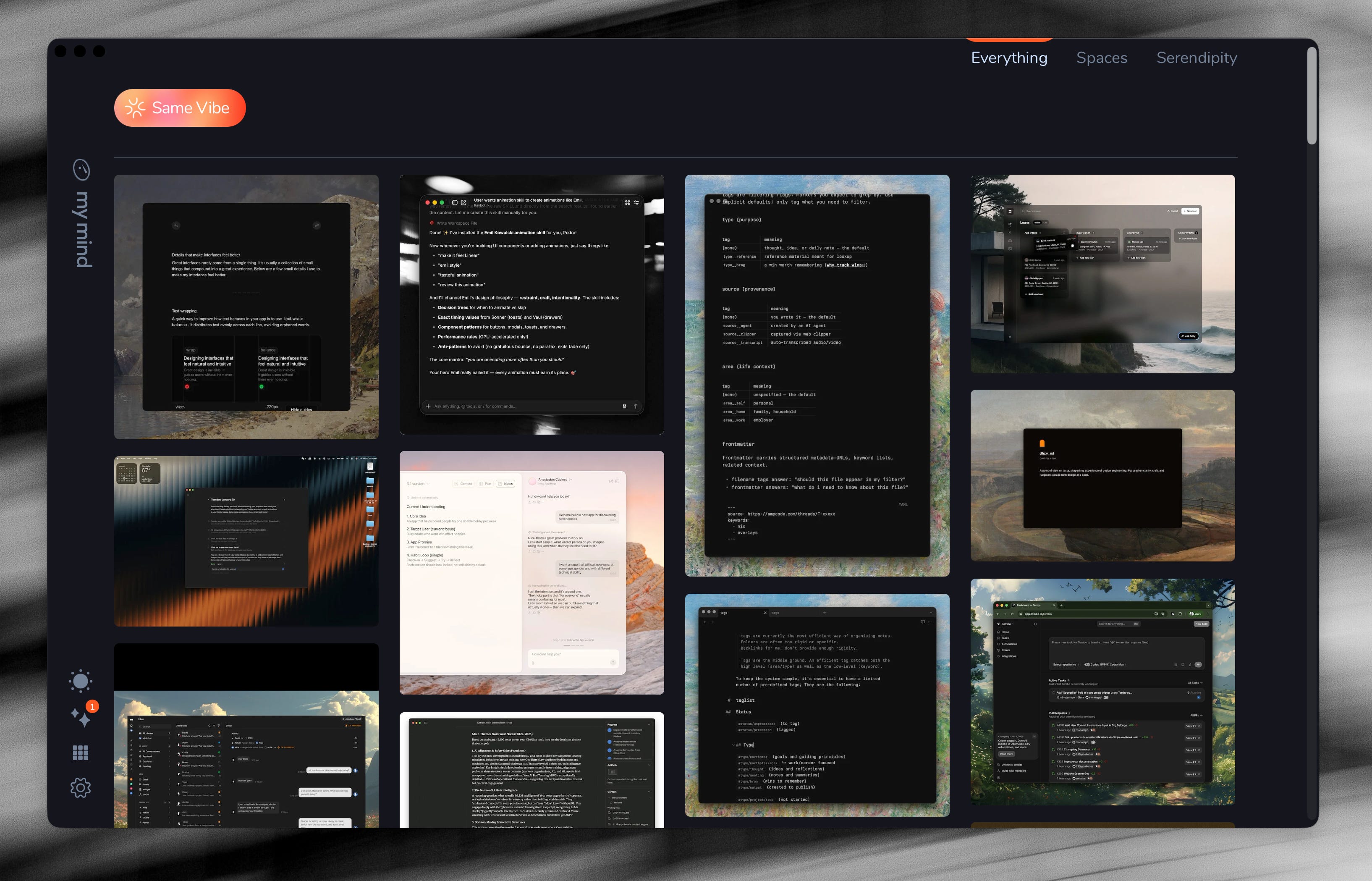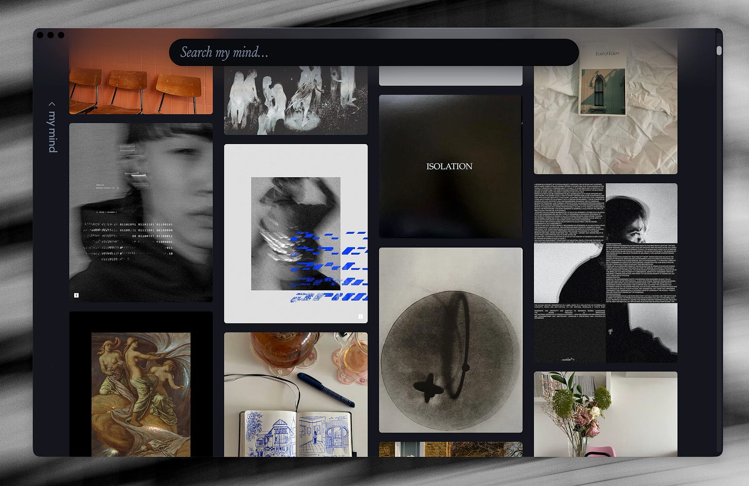 If I were somehow able to hook MyMind up to Claude and use it in tandem with Obsidian, it would be fucking incredible - but this is not the case as of yet! From my experimenting with image generation and using Claude to build websites/applications, using good and cohesive reference material for visualisation is all the more important than the efficiency/effectiveness of the prompt - so I am predicting that as time goes on it’s going to be even more valuable to have a collection of visual references.