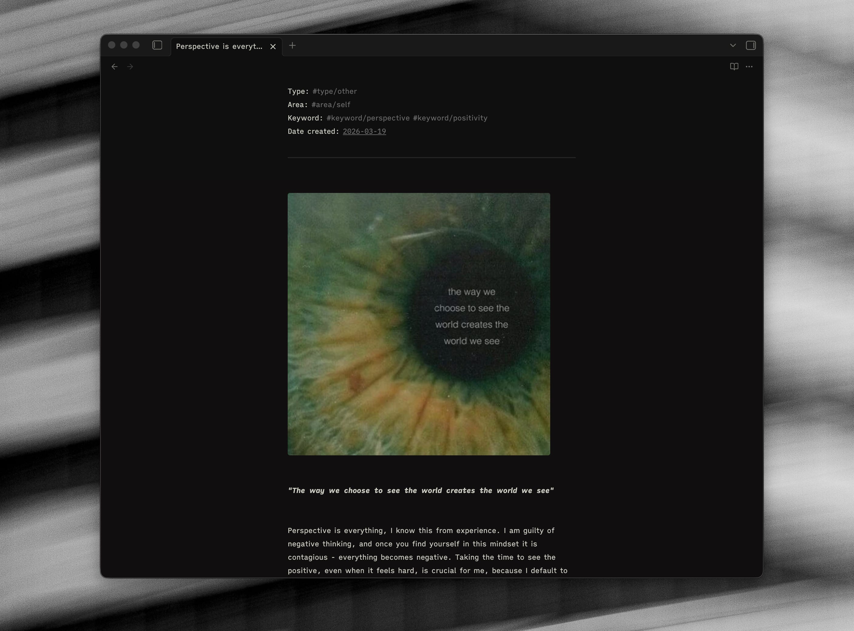 Every now and then there are some cases where I will move an image from MyMind to Obsidian, if I want to write about it in more detail. There are a few examples of where I have dived deeper specifically into why a particular visual has resonated with me, and the various things I notice about it.