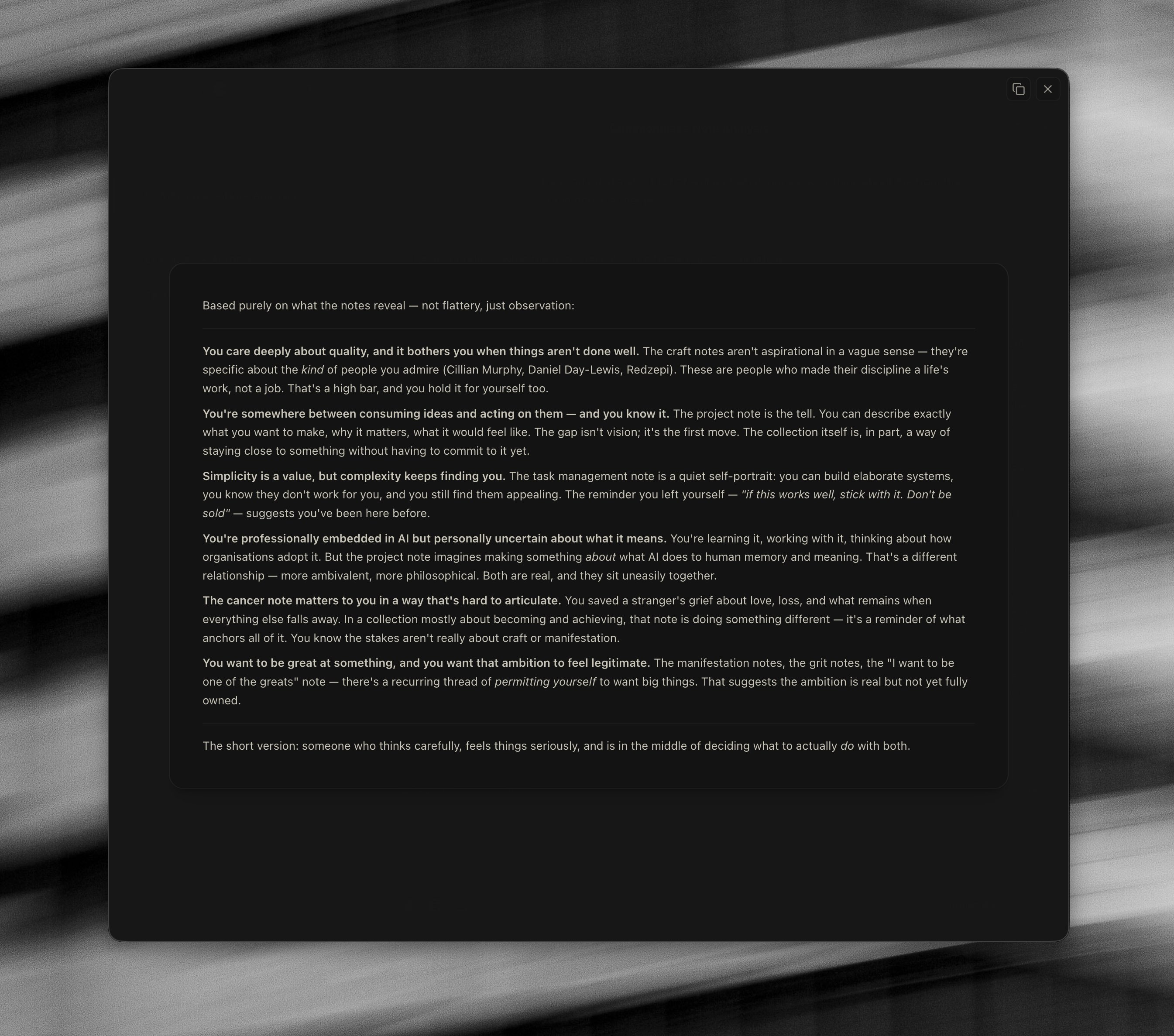 Whilst there is a lot there, it is able to articulate me and what I hold dear incredibly well. It spots common themes, and builds a picture of who you are. I have been consistently surprised at how well it picks up on small nuances and can flesh out patterns that even I (as someone who considers themself generally pretty self-aware) have not been able to uncover.