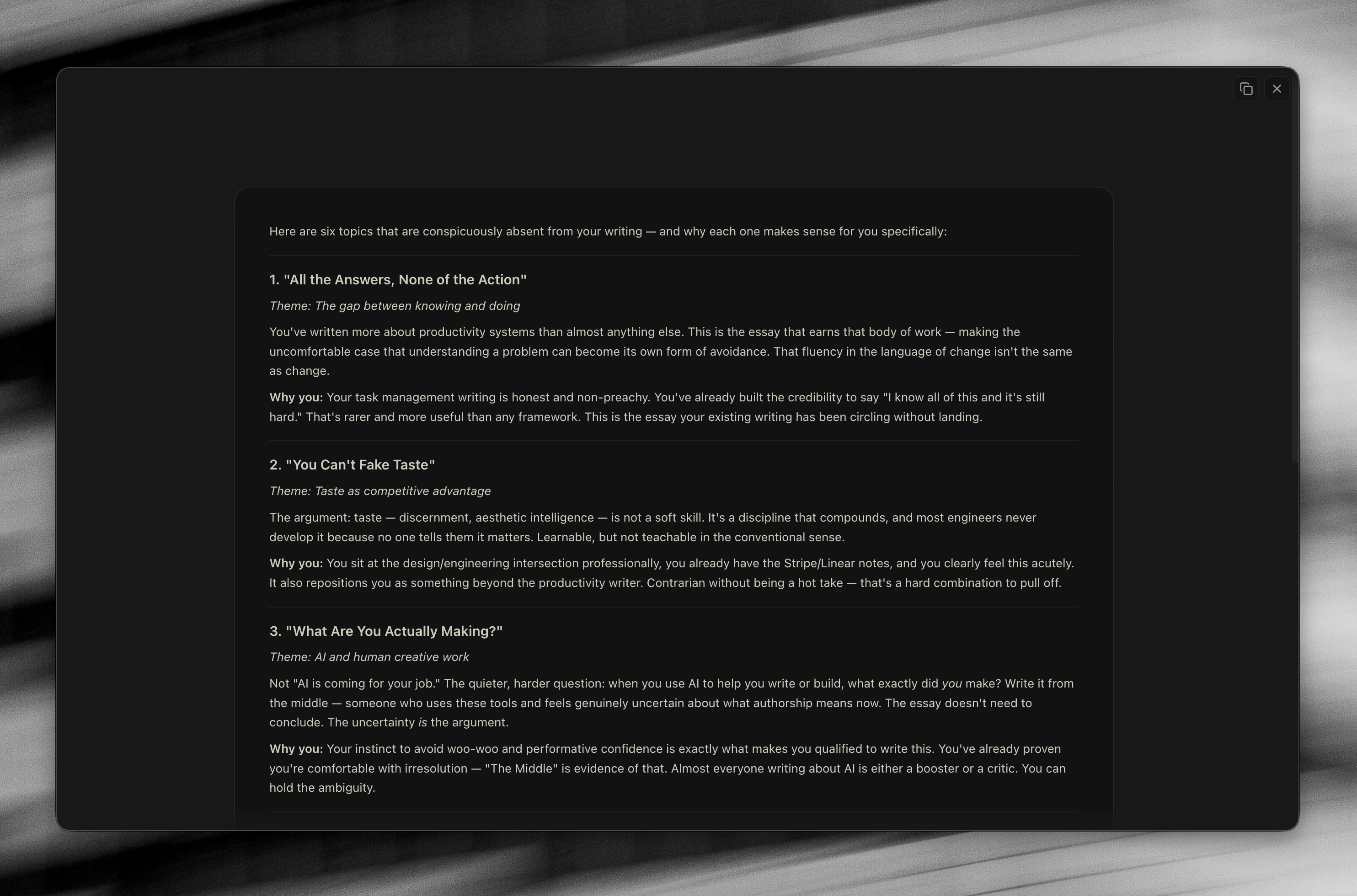 An example below, when asking about suggesting topics for me to write about - rather than doing what people typically do and saying something like “what articles should I write about X topic” - it can suggest things that it notices I take a lot of notes on but that are missing from my outputs.